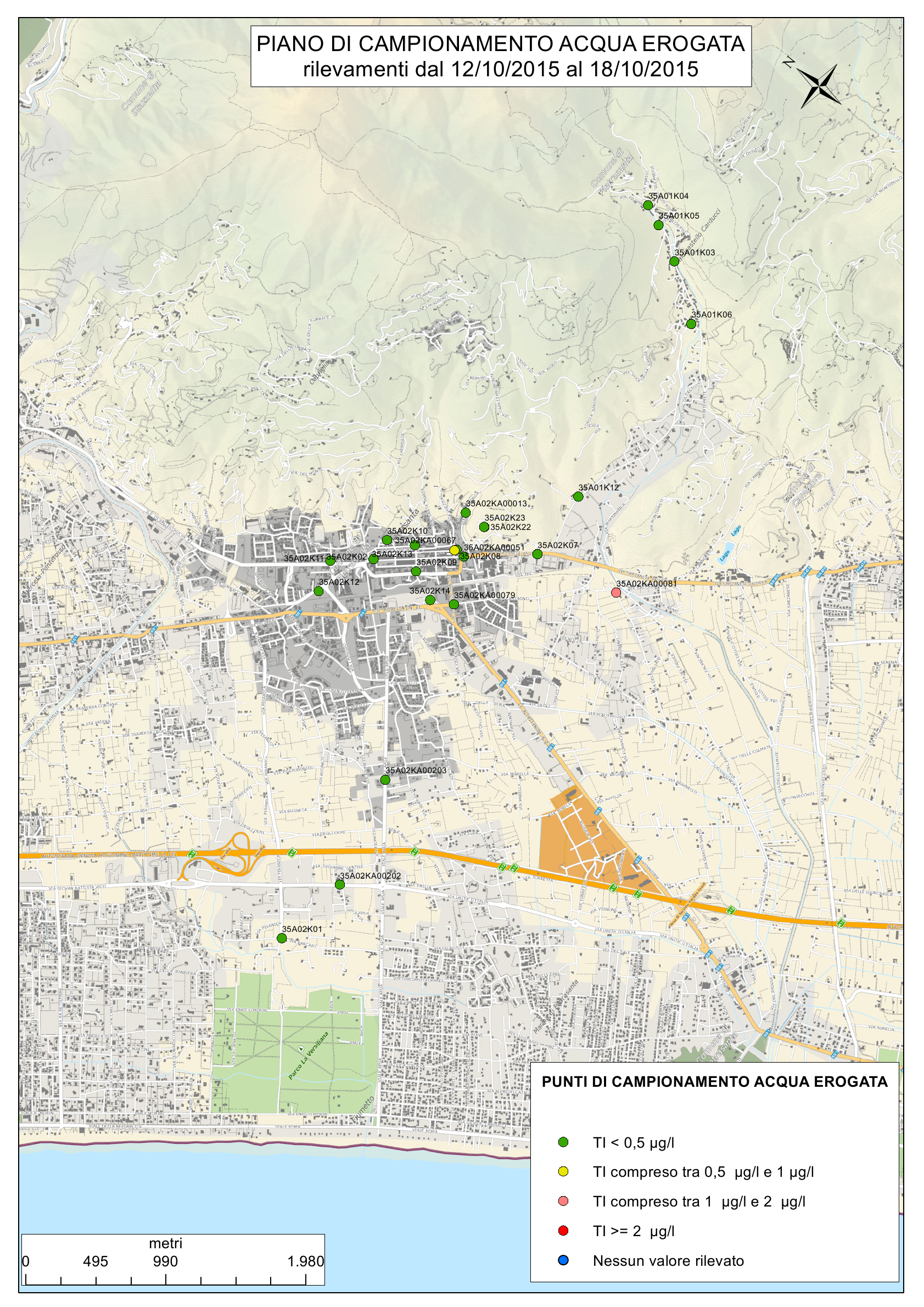 Per quanto invece riguarda le analisi invece sono 335 i punti di campionamento sulle acque inseriti nel Piano di monitoraggio. Durante il periodo di emergenza, sono state effettuate 40 nuove analisi ogni settimana; successivamente, dal momento che è da circa un anno che non si hanno più superamenti in rete nè a Pietrasanta nè a Valdicastello, si è scesi a 20. Dall'inizio della crisi  nell'ottobre 2014  sono state effettuate, nel solo comune di Pietrasanta n. 3000 analisi per la ricerca del tallio in rete.